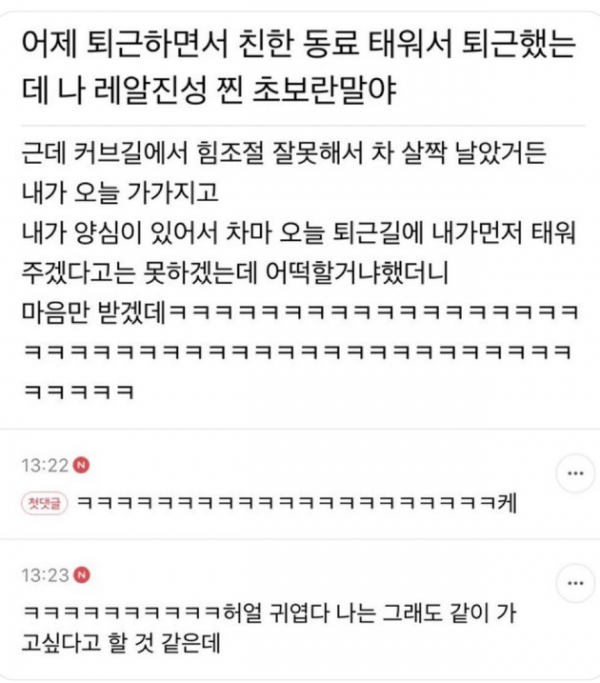 어제 일 끝나고 친한 동료 태워서 같이 퇴근했는데... 준스통 0 132 0 0 2024.06.08 13:41 zz 0 0 Author 0 0 Lv.9 준스통 실버 100,650 (34.6%) 등록된 서명이 없습니다.